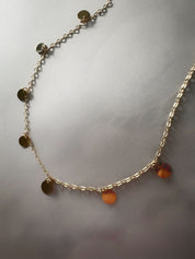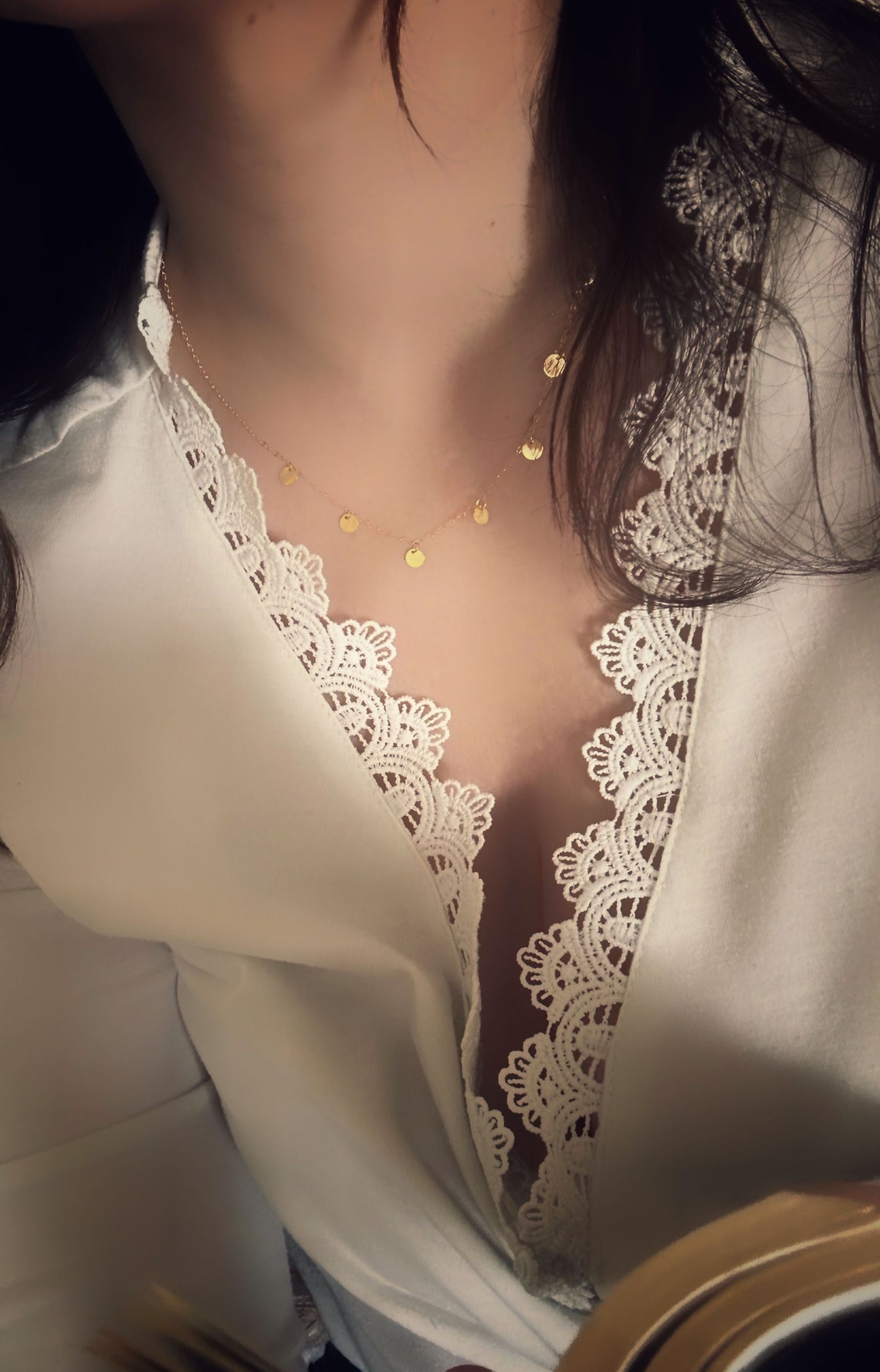 Composé d'une fine chaîne Forçat limée, il arbore sept petits disques à la finition lisse et brillante. Ils évoquent de joyeuses cymbales! Vivant sur le torse, ce collier accompagne délicatement son mouvement, les disques reflétant tout à tour la lumière. Il peut être porté au quotidien comme pour les occasions marquantes.
